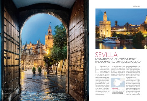 La imagen de la Giralda, vista desde la puerta de los Reales Alcázares, que abre el reportaje fue realizada en Abril del 2010. Para su edición se utilizó la información de 48 tomas unidas en hdr y fusión panorámica, posteriormente procesadas por micro zonas. Este reportaje sobre la capital andaluza, con texto de Alejando Luque, sirve como apertura al número 133 de la edición viajera de National Geographic, que salió a la calle en la segunda mitad de Marzo de 2011. La fotografía fué seleccionada a través del banco fotográfico especializado en imágenes de alta resolución Fototeca 9X12